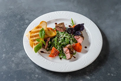 Стейк-салат с говядиной, томатами, рукколой и пармезаном